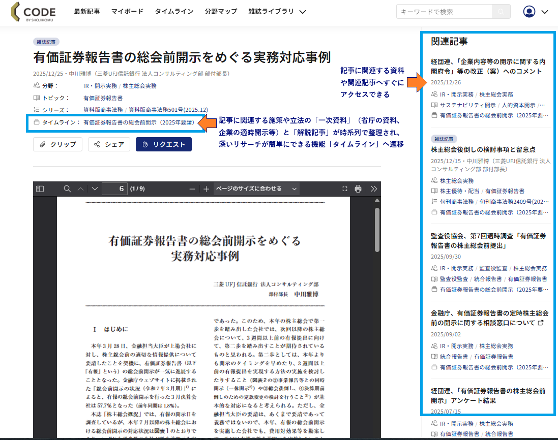 このたび、資料版商事法務の記事閲覧だけでなく、関連する施策や立法やそれらの解説記事、適時開示情報などがわかりやすく整理され、ご担当の実務やご関心をお持ちのトピックに応じて簡単に最新情報を入手できる新しいサービス「CODE」をリリースいたしました。